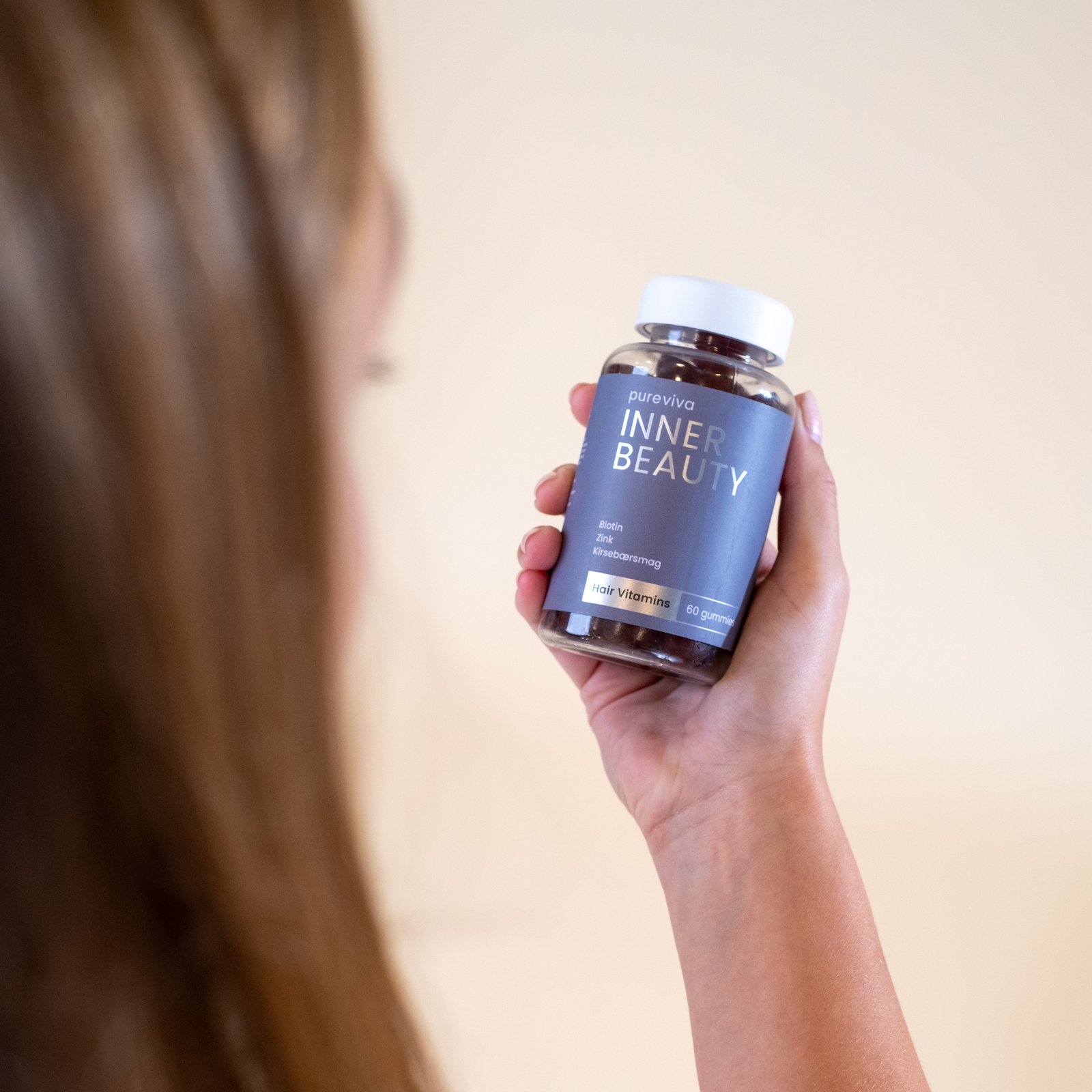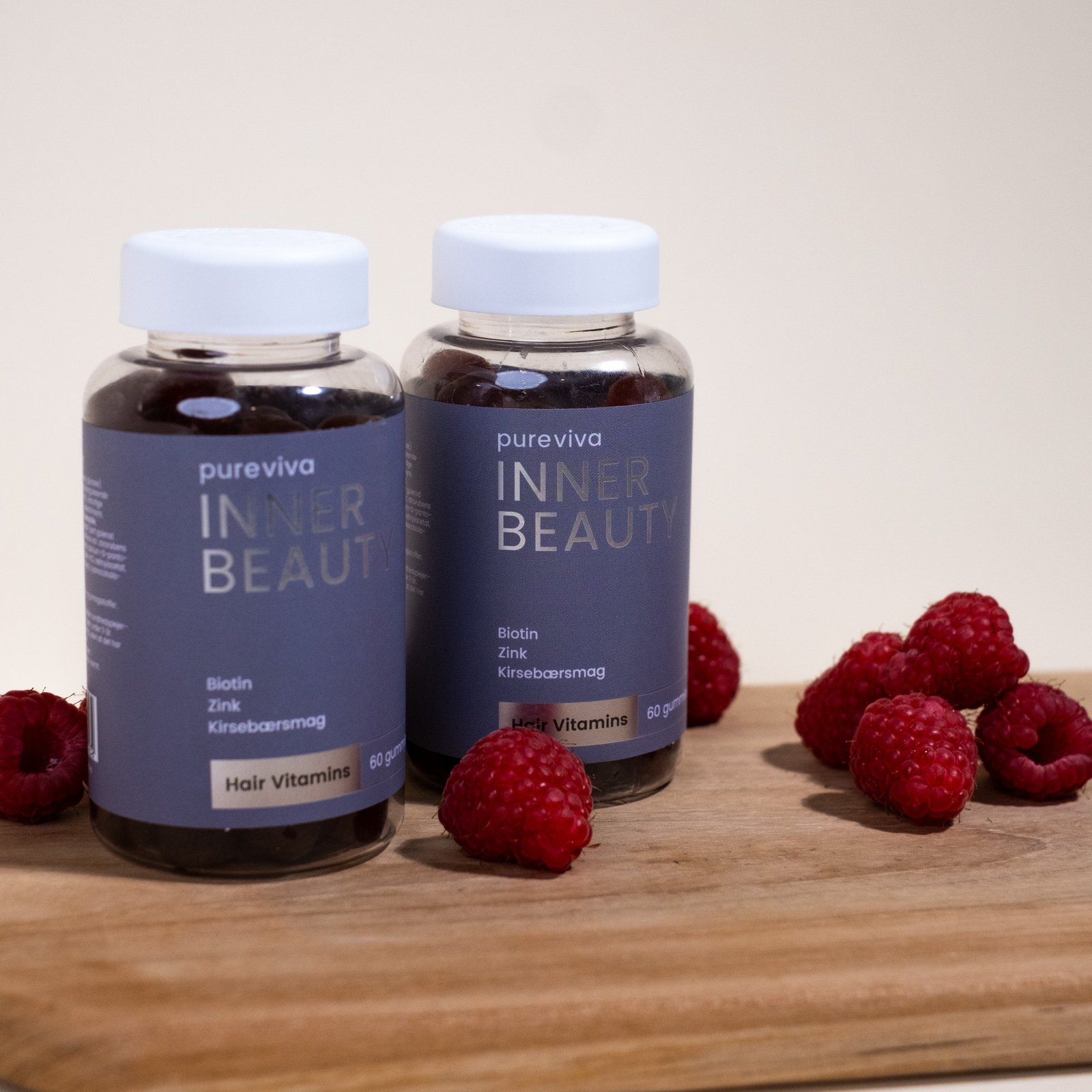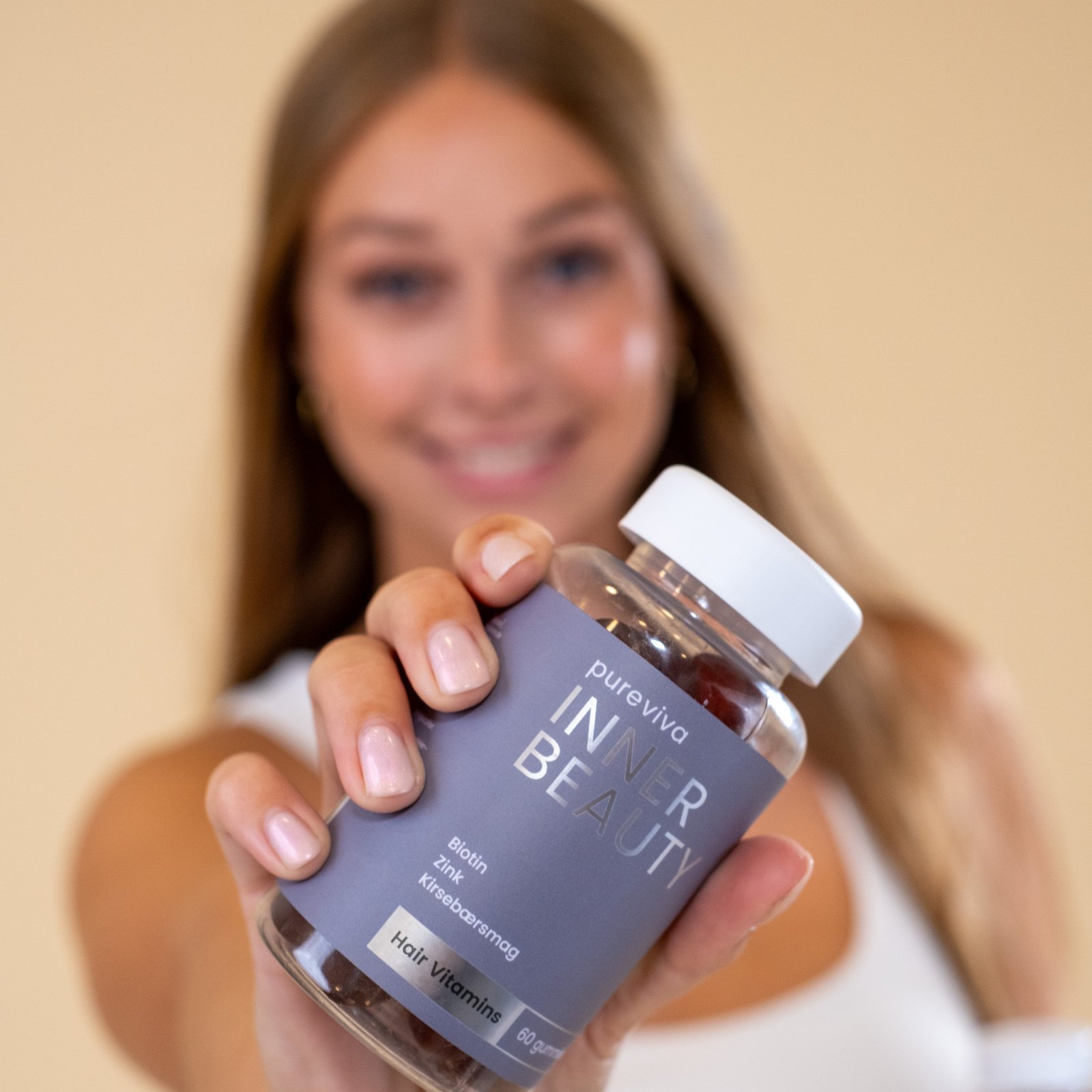 Med Pureviva Inner Beauty Hair Vitamins får du et dagligt boost indefra, der gør det nemt at prioritere din skønhedsrutine – uanset om du er på farten eller hjemme. De små gummies er lette at tage og har en naturlig, frugtig smag, som gør det til en fornøjelse at huske dine vitaminer hver dag.
