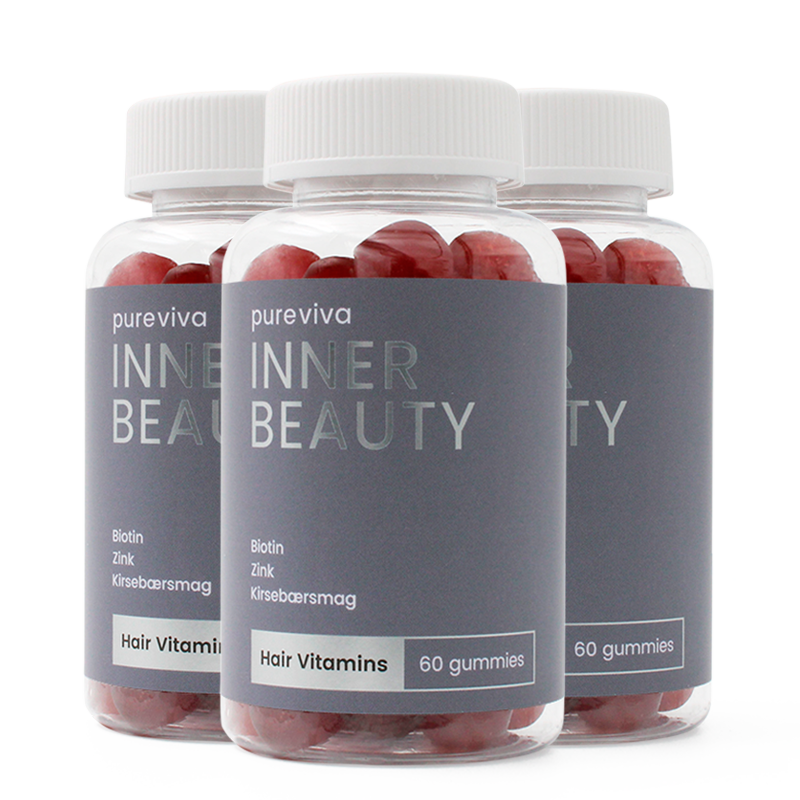 Pureviva Inner Beauty Hair Vitamins (60 stk) er et kosttilskud i vingummiform til dig, der ønsker at støtte vedligeholdelsen af normalt hår, hud og negle – og samtidig nyde en lækker smag af jordbær og kirsebær.