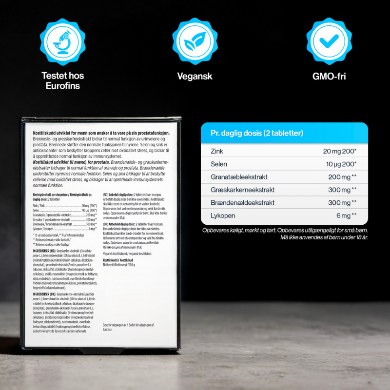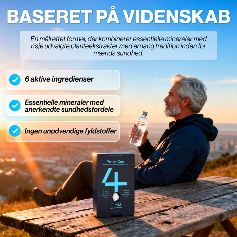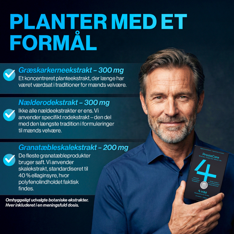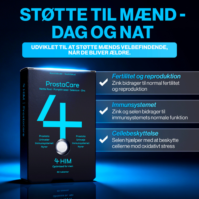 Mange mænd oplever, hvordan kroppens behov ændrer sig med alderen, og det kan give anledning til at tænke over, hvordan man bedst dækker sit ernæringsbehov. Netop derfor er det vigtigt at give kroppen de rette næringsstoffer for at opretholde balance og funktion. 4 HIM ProstaCare er et vegansk kosttilskud, der er skræddersyet til mænds specifikke behov, og som er udviklet til at være en enkel del af den daglige rutine. Med en omhyggeligt sammensat formel indeholder produktet bl.a. zink og selen.