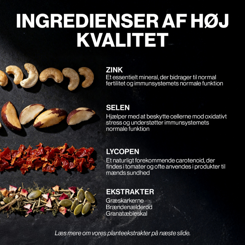 Hver tablet af 4 HIM ProstaCare indeholder en nøje udvalgt kombination af mineraler, der er essentielle for mænds ernæring. Formlen er beriget med zink. Zink bidrager til at vedligeholde et normalt testosteronniveau i blodet og bidrager til en normal frugtbarhed og reproduktion. Derudover indeholder tilskuddet selen. Selen bidrager til normal dannelse af sædceller. Denne sammensætning gør 4 HIM ProstaCare til et relevant valg for manden, der ønsker at supplere sin kost med disse næringsstoffer.