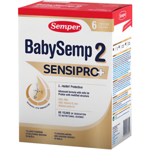Ved køb af Semper BabySemp 2 Sensipro+ får du en pakke med 2 poser af 350 g. De to poser giver dig cirka 5 liters færdigblandet kosttilskud. Tilskuddet er formuleret med en unik formel, der blandt andet indeholder mælkesyrebakterier L. reuteri Protectis®. OBS! mælkesyrebakterien L. reuteri Protectis® kan ikke tåle temperaturer over 40 grader. Opvarm dermed ikke tilskuddet til mere end 40 grader celsius.