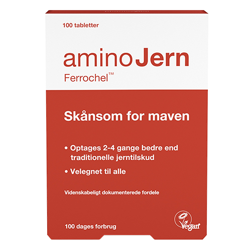 AminoJern er et 100% vegansk jerntilskud med høj optagelighed, skånsom for maven. Støtter energi, immunforsvar og ilttransport. Velegnet til alle, inkl. gravide og veganere.