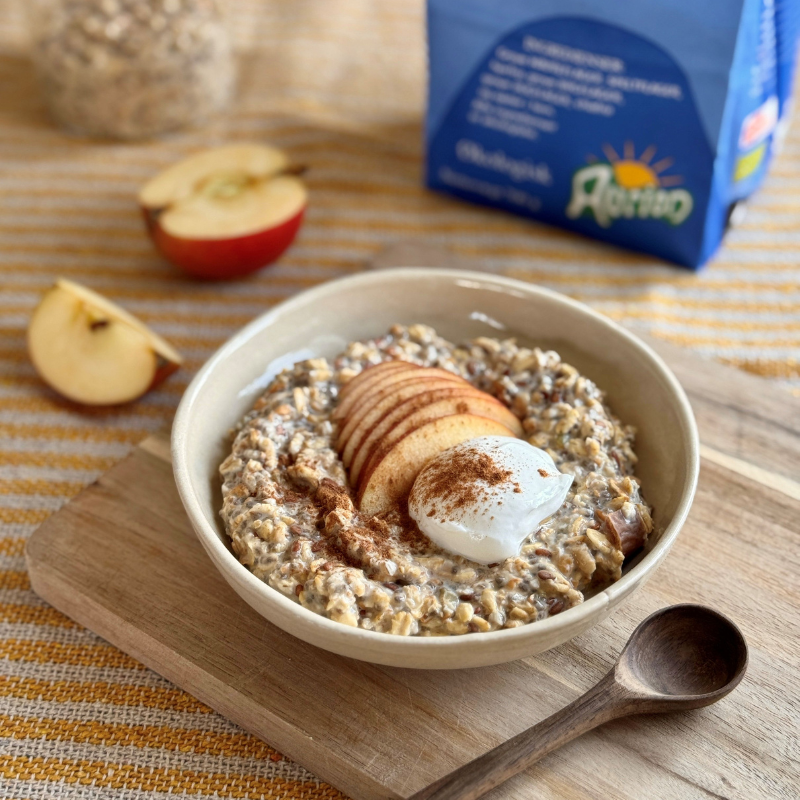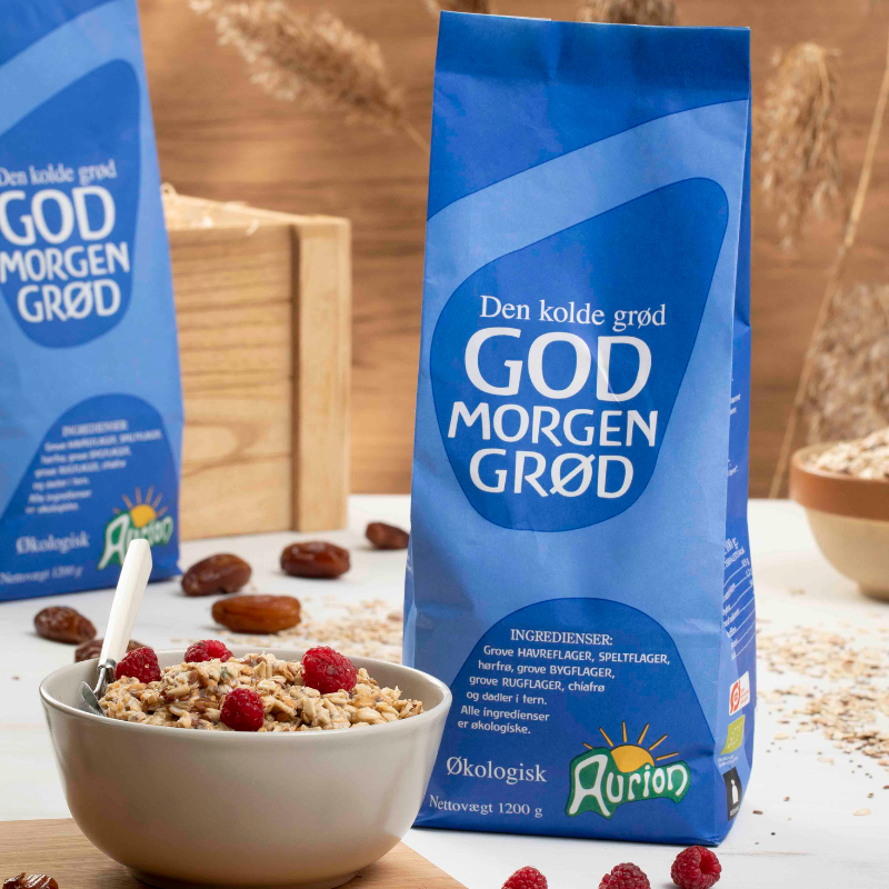 Godmorgen Grød er en køleskabsgrød med grove flager af rug, byg, havre og spelt tilsat chia- og hørfrø og let sødme fra hakkede dadler.