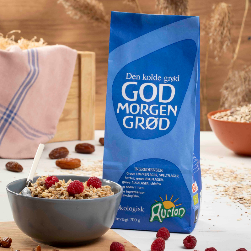 Godmorgen Grød er en køleskabsgrød med grove flager af rug, byg, havre og spelt tilsat chia- og hørfrø og let sødme fra hakkede dadler.