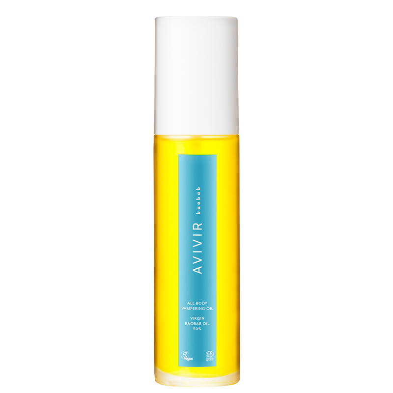 AVIVIR Baobab All Body Pampering oil (100 ml) er en kropsolie med økologisk baobabolie, mandelolie og naturligt E-vitamin, der fugter, blødgør og absorberes hurtigt uden at fedte.
