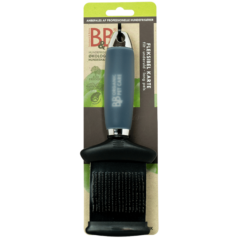 B&B's fleksibel karte med børste på begge sider, følger nænsomt hundens kropsfacon og er skånsom for huden.