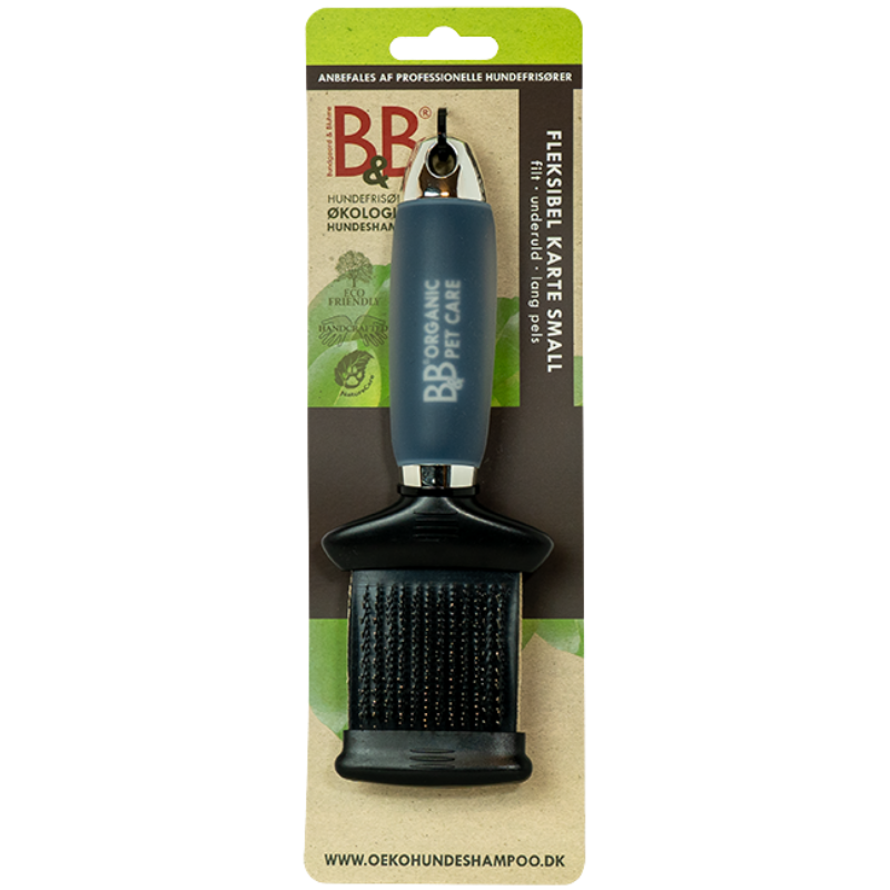 B&B's fleksibel karte med børste på begge sider følger nænsomt hundens kropsfacon og er skånsom for huden.