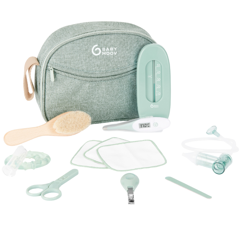 Det nye Babymoov øko-designede babyplejesæt, med alt det essentielle tilbehør, du har brug for til din babys daglige hygiejne. En virkelig nyttig nyfødtgave til kommende forældre! Babymoov bestræber sig altid på at opfylde dine behov så vidt muligt, og de har udvalgt 10 essentielle tilbehør til at sammensætte dette babyplejesæt. Uanset om du er hjemme eller ude, finder du alt, hvad du har brug for til at passe din baby med et digitalt termometer til overvågning af barnets temperatur, en uundværlig næsesuger, et badetermometer til at sikre, at vandet har den rigtige temperatur, alt hvad du behov for at passe på deres bittesmå negle (mini negleklipper, saks med afrundede spidser og en fil) samt en gummemassager til at passe på enden af en finger og en bidering der kan lægges i køleskabet for at lindre ubehag hos din baby, når deres første tænder begynder at komme igennem. I sættet finder du også tilføjet en sød, superblød børste lavet af FSC-certificeret træ til din babys fine hår. 3 genanvendelige bomuldsservietter fuldender dette sæt, designet til at pleje din babys sarte hud og reducere brugen af engangsservietter. Du kan organisere dette sæt som du vil ved at bruge de indvendige eller ydre lommer eller elastiske rum. Der er også andre tomme rum, hvor du kan tilføje yderligere tilbehør, du muligvis har brug for til din baby. Virkelig praktisk, den glider nemt ned i din pusletaske. Det store håndtag gør det nemt at bære og gør det muligt at hænge det op, uanset hvor du går.Ingredienser