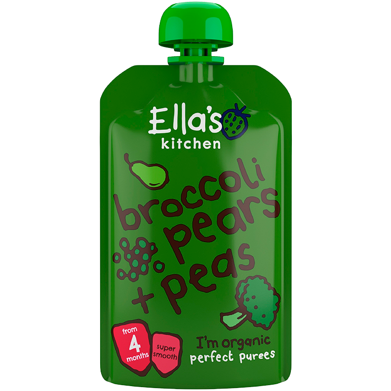 Denne mos er med smag af broccoli, pære og ærter, men findes i flere varianter. Kan gives til børn fra 4 måneders alderen. Babymosen har en dejlig blød tekstur, uden nogen former for klumper. Mosen kommer i Ellas Kitchens populære genlukkelige poser.