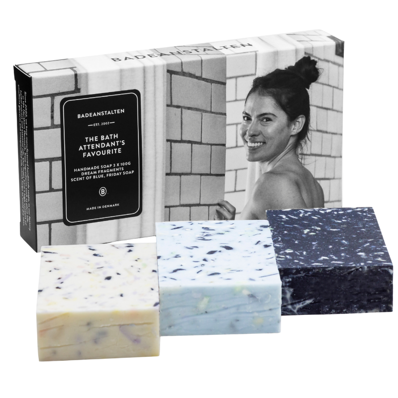 Gavesæt med håndlavet sæbe, saltskrub og badepuf, der giver en frisk spaoplevelse i eget badeværelse.