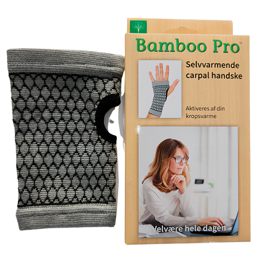 Bamboo Pro™ Carpal handske, selvvarmende str M Bamboo Pro™ carpal handsken er særdeles velegnet til personer med ømme led, belastningsskader og slid. Reducerer hævelse, ømhed, og stivhed i håndleddet.Støttebindet indeholder bambus trækul teknologi, der tilbyder selv-varmende egenskaber. Det udsender infrarøde stråler og negative ioner, der aktiveres af din kropsvarme og giver en naturlig varme til dine muskler, sener og led. Varmen øger blodcirkulationen, som igen leverer proteiner, ilt og næringsstoffer til det ramte område. Hvis du har en hævelse, kan bambus trækul tilpasse i temperatur og give en kølende effekt.Åndbart, svedabsorberende og behageligt at anvende ved computerarbejder, samlebåndsarbejde eller andet arbejde der belaster håndleddet.Carpal handsken behøver ikke at sidde stramt for at bambus trækullet bliver aktiveret. Den kan bæres hele dagen og natten, efter behov.Den naturlige varme forbedrer:- Blodcirkulationen- Stivhed- Ømme led på grund af alderen Størrelse: Mål omkredsen af din håndflade omkring dine knoer.XS= 17-19cmS=19-21cmM=21-23cmL= 23-25cmMateriale: 43 % viskose (bambus trækul), 32 % polyamid fiber, 17 % latex elastik, 8 % spandtex Vaskeanvisning: Kan maskinvaskes ved 30 °C , lufttørre eller tørres i tørretumbler ved lav varme. Støttebindet anbringes i solen eller under et spektrum lampe en gang om måneden i 1 time for at bambus trækullet genoplades.