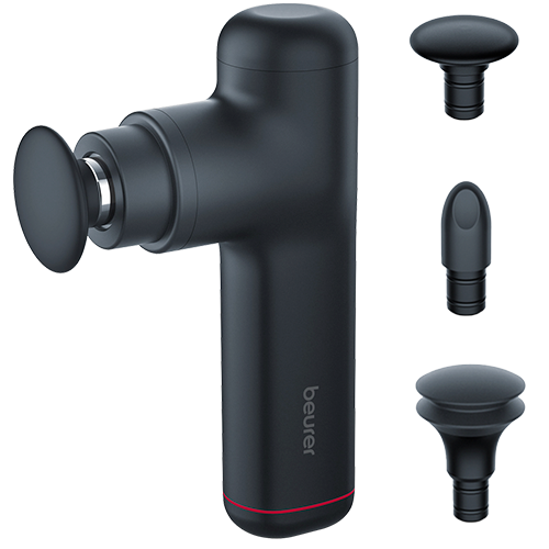 Massagegun fra Beurer med 3 forskellige massagetilbehør, der masserer mindre muskelgrupper. Den lille massagegun har 3 forskellige hastigheder og 3 forskellige hoveder, så du kan indstille den til lige præcis det, du har brug for.
