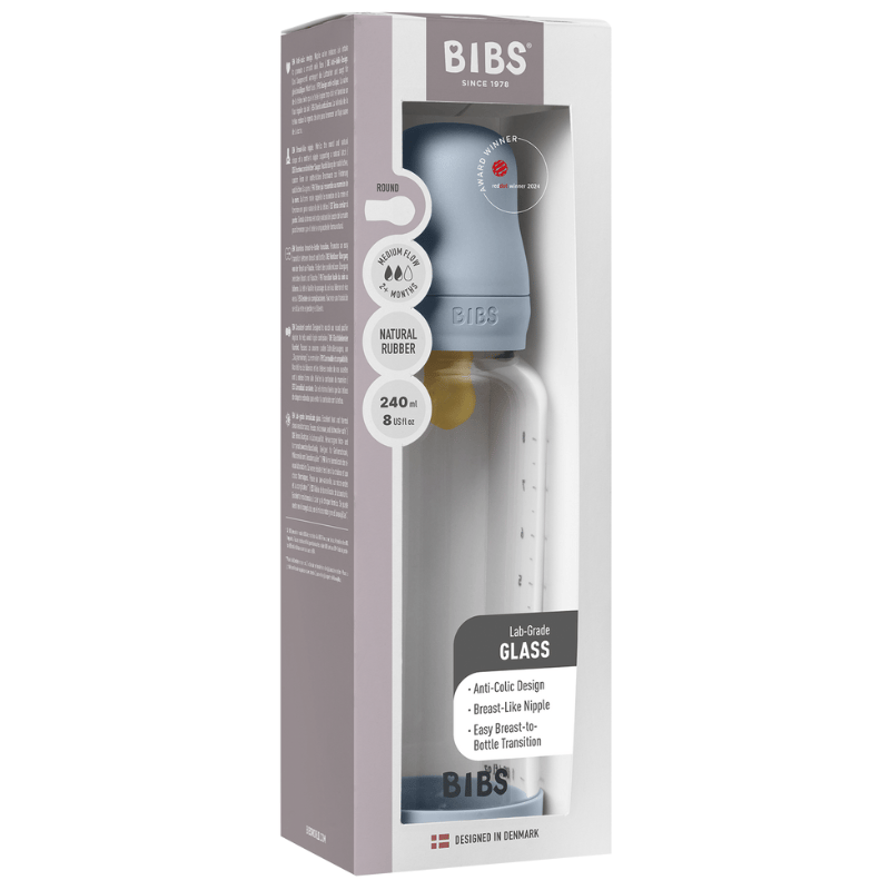 Bibs Glass Baby Bottle Round Latex Medium Flow Baby Blue (240 ml) er en sutteflaske, der er omhyggeligt designet med tanke på både babyer og forældre. At finde den rette sutteflaske kan være en udfordring, og derfor er denne flaske skabt til at gøre måltidet til en rolig og tryg oplevelse for de mindste. Den er fremstillet af borosilikatglas, som er et ekstremt holdbart og temperaturbestandigt materiale, der ikke afgiver skadelige stoffer til mælken. Flaskens design er både klassisk og funktionelt, hvilket gør den nem at holde om for forældre og let at rengøre efter brug. Den medfølgende runde sut i naturgummilatex efterligner moderens bryst, hvilket kan gøre overgangen mellem amning og flaske lettere.