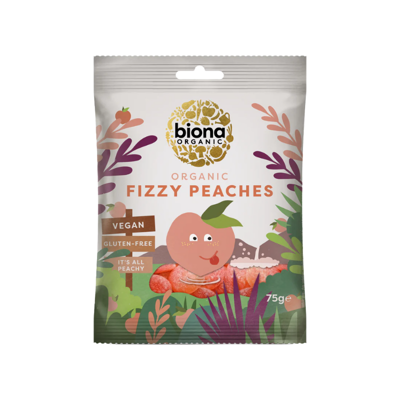 Bionas økologiske syrlige vingummier har en skøn smag af fersken fra frugtjuice. Perfekt til alle, der kan lide en vingummi med naturlig frugtsmag. Helt fri for gelatine, kunstige farvestoffer eller kunstige smagsstoffer.