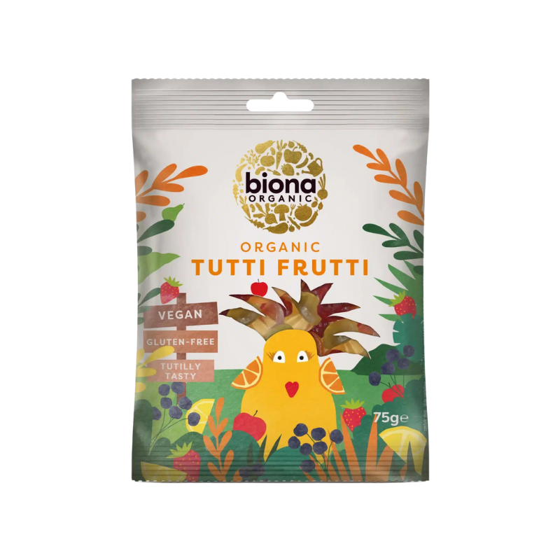 Bionas økologiske Tutti Frutti vingummier har en sød og frisk frugtsmag. Fri for gelatine, kunstige farvestoffer og smagsstoffer. Med rå rørsukker. 75 g.