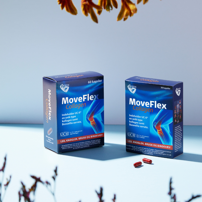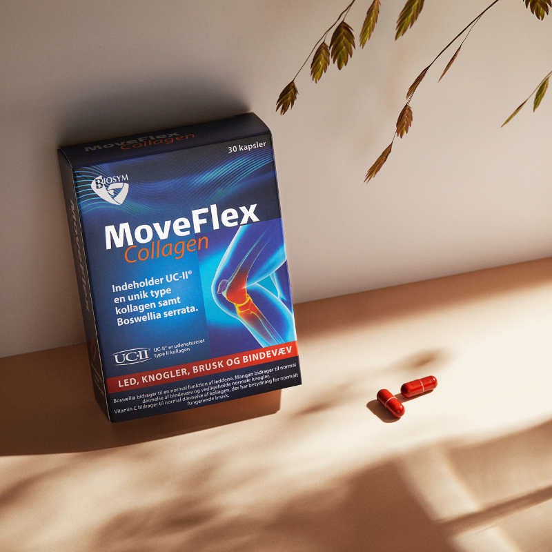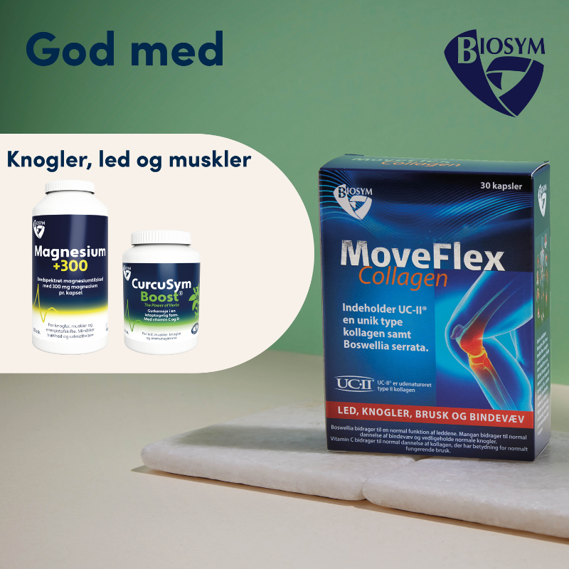 Biosym MoveFlex Collagen kombinerer UC-II kollagen, C-vitamin og Boswellia for at støtte sunde led, brusk og knogler – dansk kvalitet siden 1986.