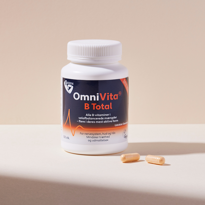 Biosym OmniVita B Total samler alle 8 B-vitaminer, cholin og inositol i én vegansk kapsel – for energi, immunforsvar og mental ydeevne.