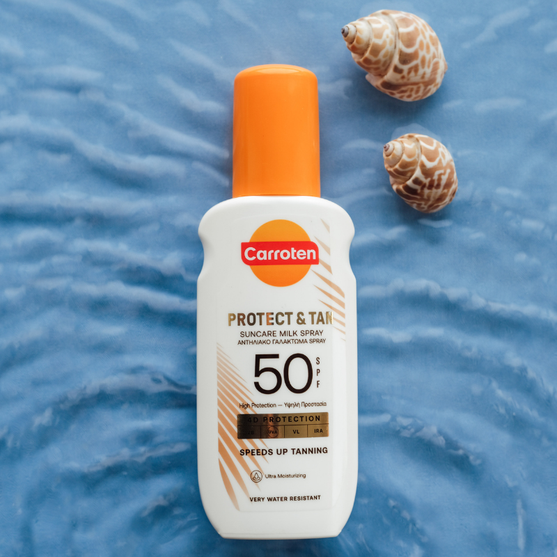 Carroten Protect & Tan Milk Spray SPF 50 beskytter effektivt huden og fremmer samtidig en smuk, gylden glød.