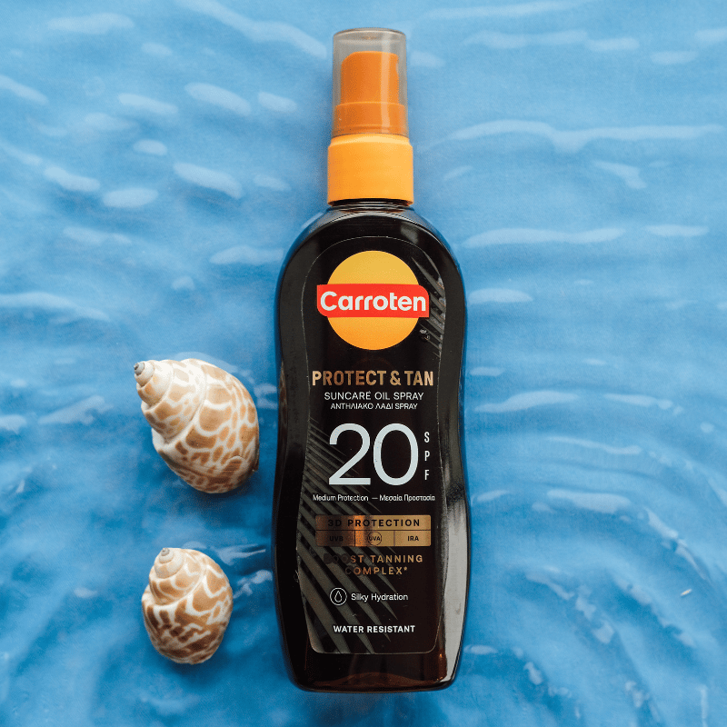 Carroten Protect & Tan Body Oil SPF 20 beskytter effektivt huden, samtidig med at den fremmer en naturlig smuk og gylden glød.