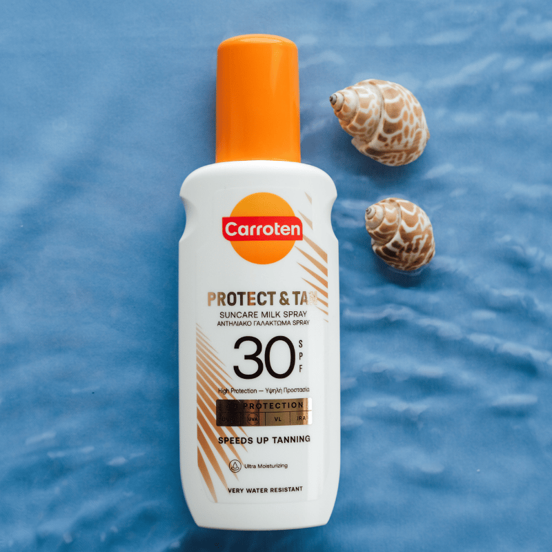 Carroten Protect & Tan Milk Spray SPF 30 beskytter effektivt huden og fremmer samtidig en smuk, gylden glød.