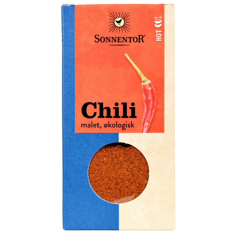 Fødevare. Chili malet, Sonnentor Ø - 40g er et økologisk og stærk chili krydderi, der er malet til et fint pulver, der er perfekt til at smage mad og dressinger til.