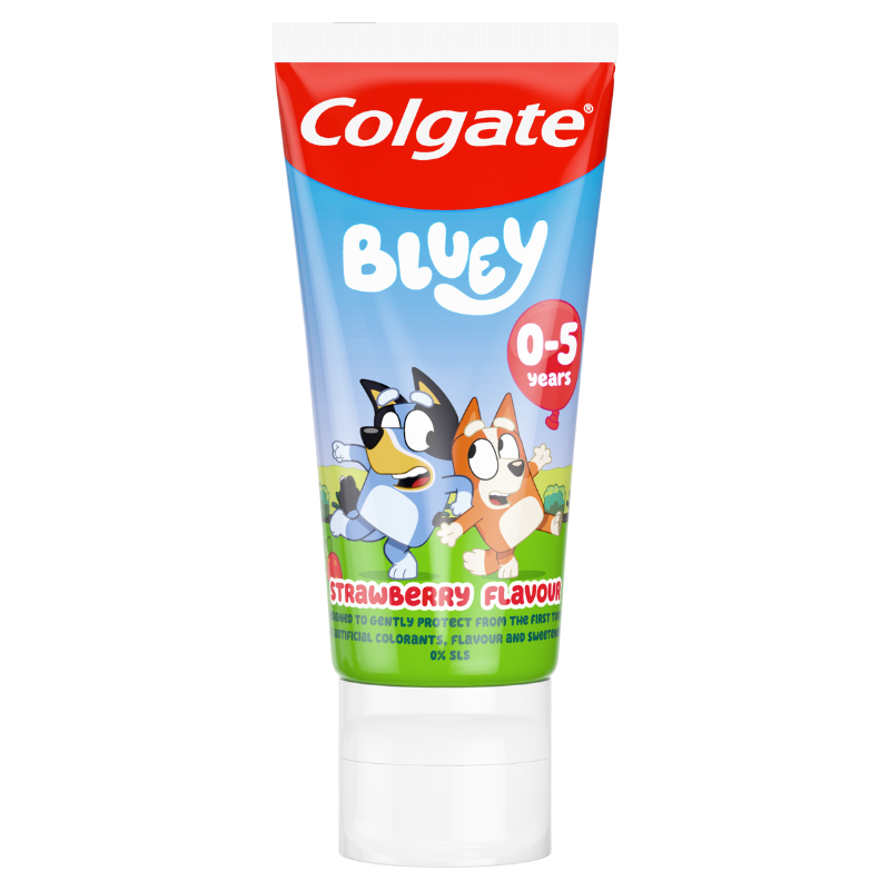 Plej dine børns tænder med Colgate Kids Bluey 0-5 Years tandpasta. Nyd Bluey og Bingo 'i det virkelige liv' med denne børnetandpasta med jordbærsmag, der skånsomt plejer mælketænderne.