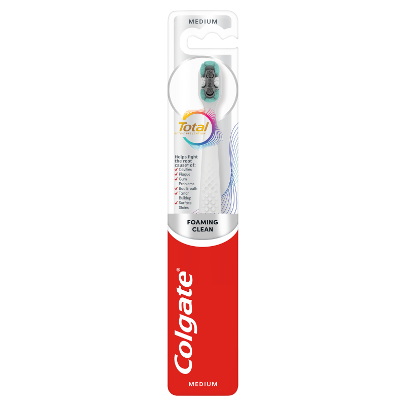 Colgate Total Active Prevention Foaming Clean tandbørste med medium børstehår er specielt designet til at bekæmpe hovedårsagen* til huller i tænderne, plak, tandkødsbetændelse, dårlig ånde, tandsten** og misfarvninger***.