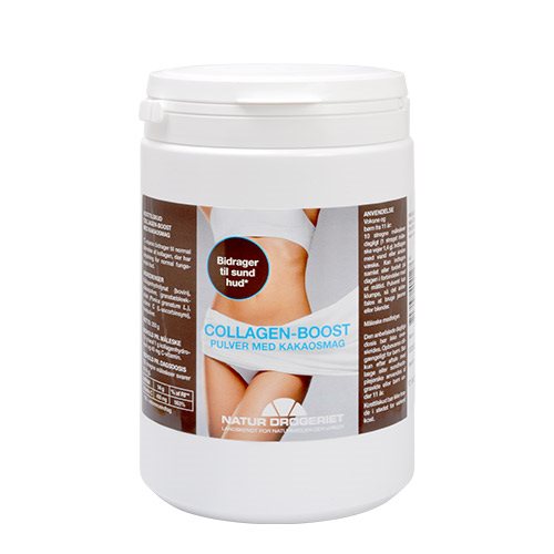Natur Drogeriet Collagen Boost m. kakaosmag indeholder C-vitamin, Collagen-Boost hydrolyseret kollagen og granatæbleekstrakt med ellaginsyre og kisel. Vitamin C bidrager til normal dannelse af kollagen, der har betydning for normalt fungerende hud.