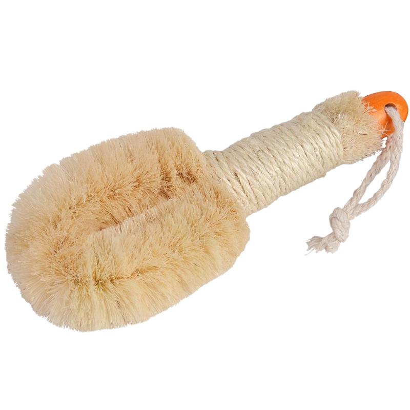 Rund massagebørste med sisalfibre stimulerer blodcirkulationen og hjælper med at løsne spændinger i huden. Den har et ergonomisk design for komfortabel brug.