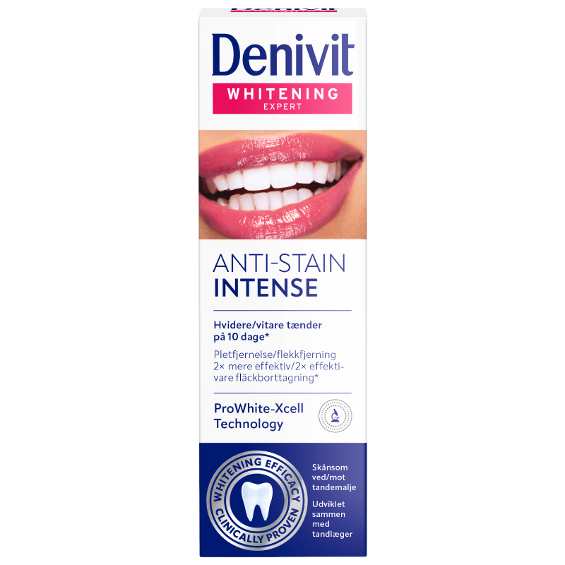 Få synligt hvidere tænder med Denivit Anti-Stain Tandpasta. Denne fluortandpasta fjerner intensivt misfarvninger dobbelt så effektivt, uden at skade emaljen. Oplev hvidere tænder på kun 10 dage og nyd en langvarig frisk ånde med hver børstning.