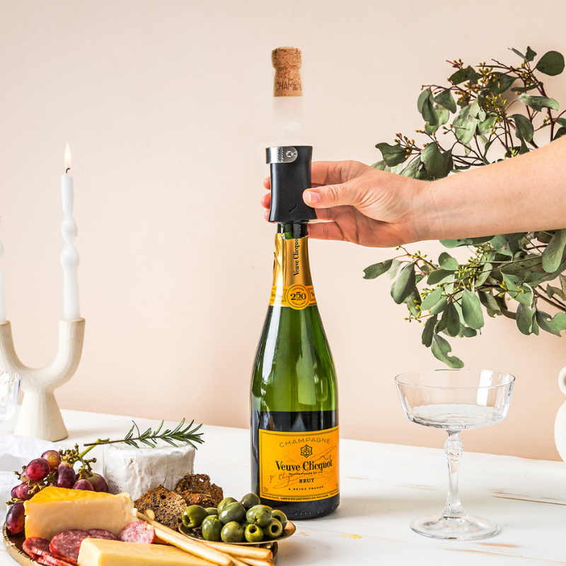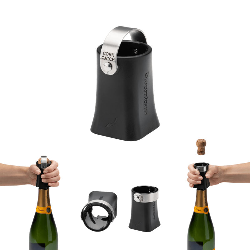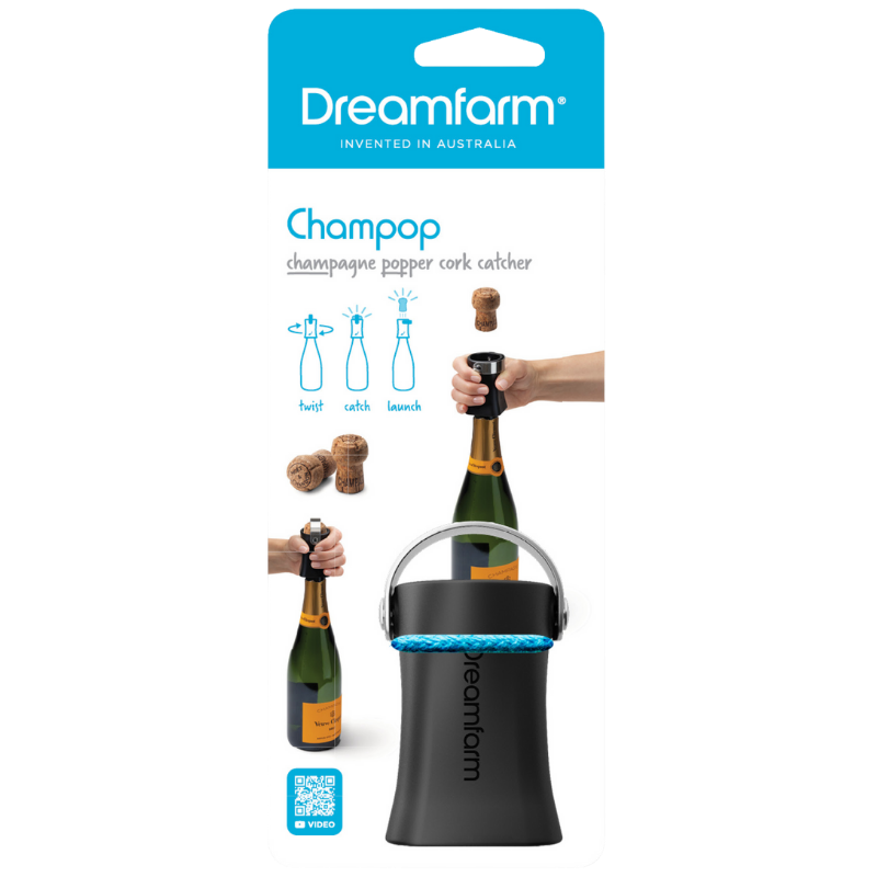 Champop fra Dreamfarm er en smart og brugervenlig champagneprop-fjerner, der sikkert åbner og fanger proppen fra champagne og mousserende vine, eller lader den flyve op i luften ved festlige lejligheder. Drej og pop - Champops unikke indvendige gevind trækker sikkert og nemt champagneproppen ud, når den drejes på en flaske. I oprejst position fanger den rustfri stålsløjfe sikkert den sprængte prop, så ikke der farer vildtflyvende champagnepropper rundt i lokalet. Gasudtag reducerer den sprængte champagneprops hastighed, hvilket gør den perfekt til både indendørs og udendørs fejringer, fester, barer og særlige lejligheder. Til udendørs sammenkomster kan løkken i rustfrit stål vippes ned, så den sprængte champagneprop skyder lige op i himlen. Mere festligt bliver det ikke! Perfekt til bryllupsfesten, fejring af studenten eller når det nye år skal skydes ind. Materiale er ABS og rustfrit stål. Farve: Sort/stål. Tåler opvaskemaskine. BPA-fri.Ingredienser