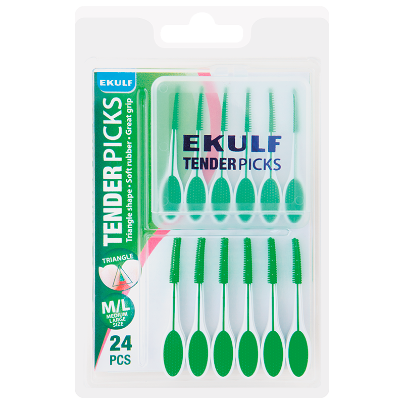 Hold dine tænder og tandkød sunde med Ekulf TenderPicks. Disse bløde og fleksible tandstikkere fjerner effektivt plak og madrester mellem tænderne. Størrelsen M/L er ideel til mellemstore til større mellemrum og sikrer en skånsom rensning.