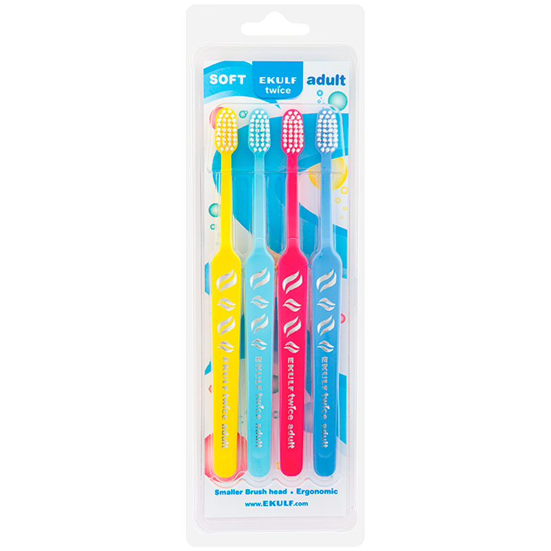 Hold dine tænder rene og sunde med Ekulf Twice Adult tandbørster. Denne praktiske 4-pak er designet til voksne og sikrer, at du altid har en frisk tandbørste klar til at opretholde en optimal mundhygiejne i hverdagen.