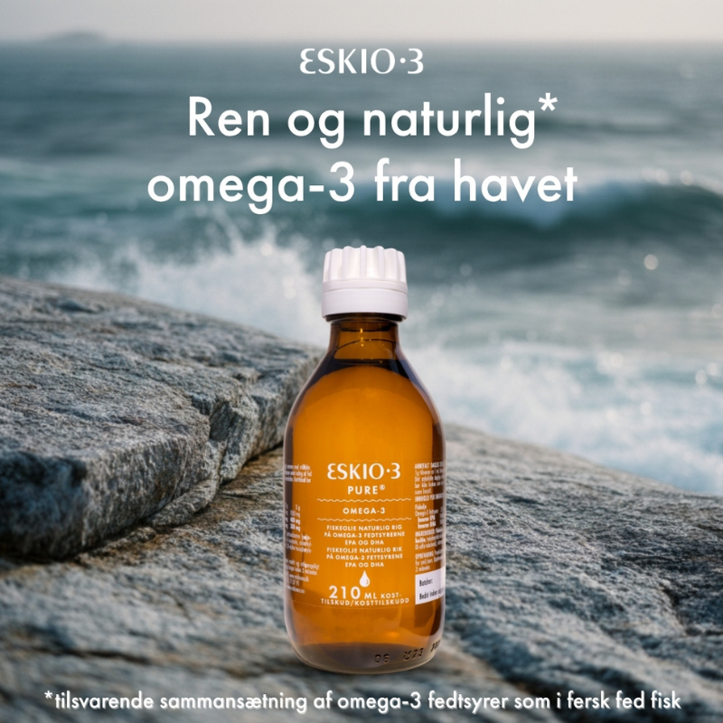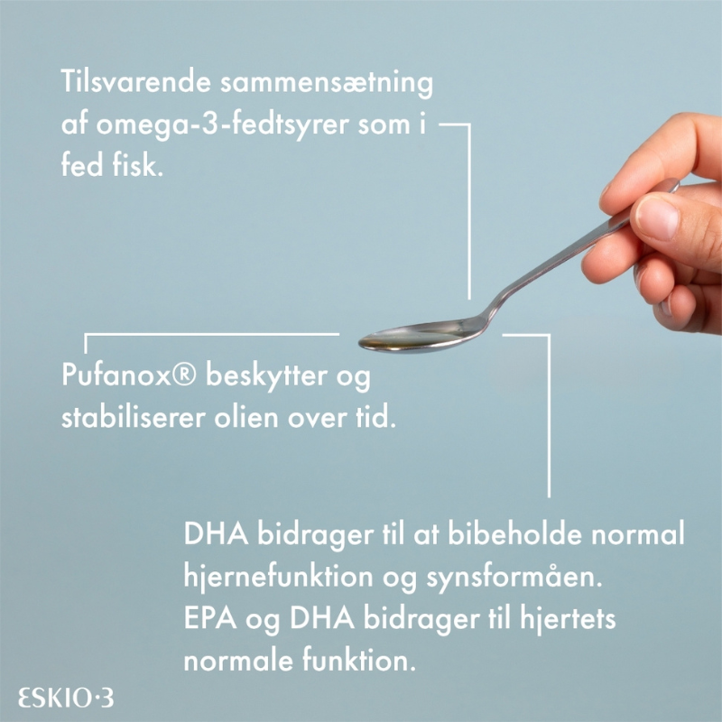 Eskio-3 Pure med let citrussmag har et naturligt indhold af omega-3 fedtsyrer (38%), dvs. samme form, sammensætning og balance af omega-3 fedtsyrer, som fås ved at spise frisk fed fisk. Produktet indeholder naturlige antioxidanter, som består af naturlig E-vitamin, olieopløselig ascorbinsyre og lecithiner, men er renset for tungmetaller og pesticider, som f.eks. kviksølv, bly og dioxiner. Eskio-3 er en del af en varieret kost.