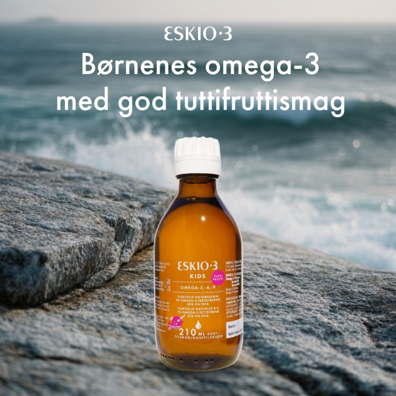 Eskio-3 Kids med Tutti-Frutti smag er et kosttilskud som består af fiskeolie, rapsolie samt vitaminerne E og D.