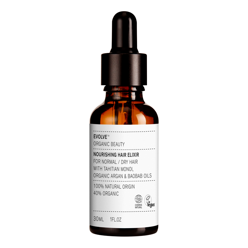 Evolve Organic Beauty Nourishing Hair Elixir, bidrager til at genvinde tabt fugt og beskytter dit hår mod miljøskader.