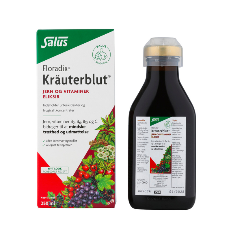 Floradix Kräuterblut indeholder organisk jern fra ferrogluconat, vitaminerne B2, B6, B12 og C som bidrager til at mindske træthed og udmattelse og til et normalt energistofskifte. Desuden bidrager jern til normal dannelse af røde blodlegemer (støttes af vitaminer B6 og B12) og hæmoglobin. Endvidere øger vitamin C optagelsen af jern.