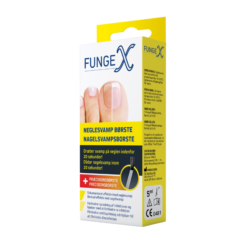 "Kun til udvendig brug.\n• Opbevares utilgængeligt for børn.\n• Undgå kontakt med øjne og slimhinder.\n• I tilfælde af overfølsomhed skal du stoppe med at\nbruge FungeX neglesvamp børste.\n• Kontakt din læge, hvis der ikke er nogen forbedring inden for to uger.\n• Kontakt din læge før brug, hvis du er gravid eller ammer."