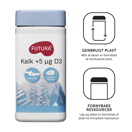Futura Kalk er med til at vedligeholde dine knogler og tænder, så de er stærke hele livet. Kosttilskuddet indeholder også D-vitamin, som bidrager til optagelsen af fosfor og calcium.
