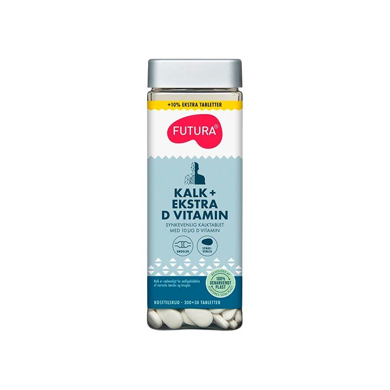 Futura Kalk + Ekstra D-Vitamin (300+30 tabl) er et kosttilskud, der indeholder høje doser af D-vitamin og calcium.