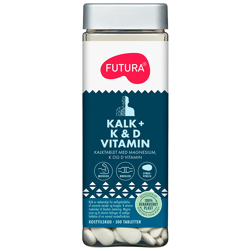Futura Kalk + K + D + Magnesium styrker knogler, tænder og muskler. Synkevenlige tabletter med calcium, magnesium, D- og K-vitamin. Ideel til daglig sundhed.