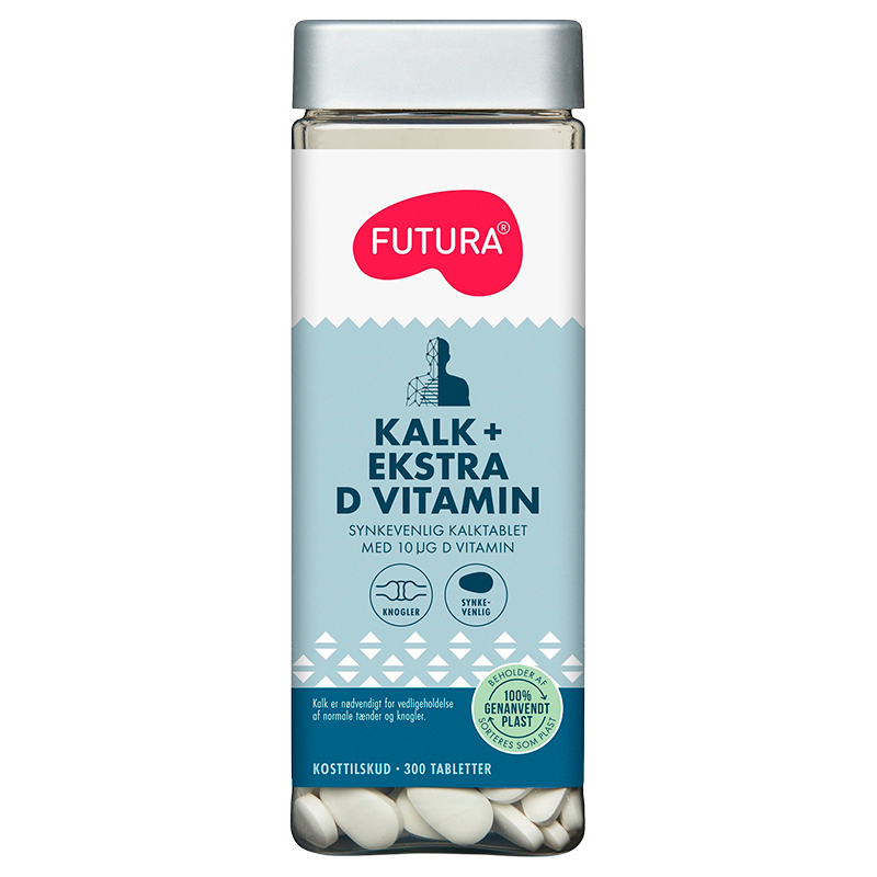 Futura Kalk + Ekstra D-Vitamin styrker knogler, tænder, muskler og immunforsvar. 800 mg calcium og 5 µg D-vitamin pr. dag. 300 tabletter.