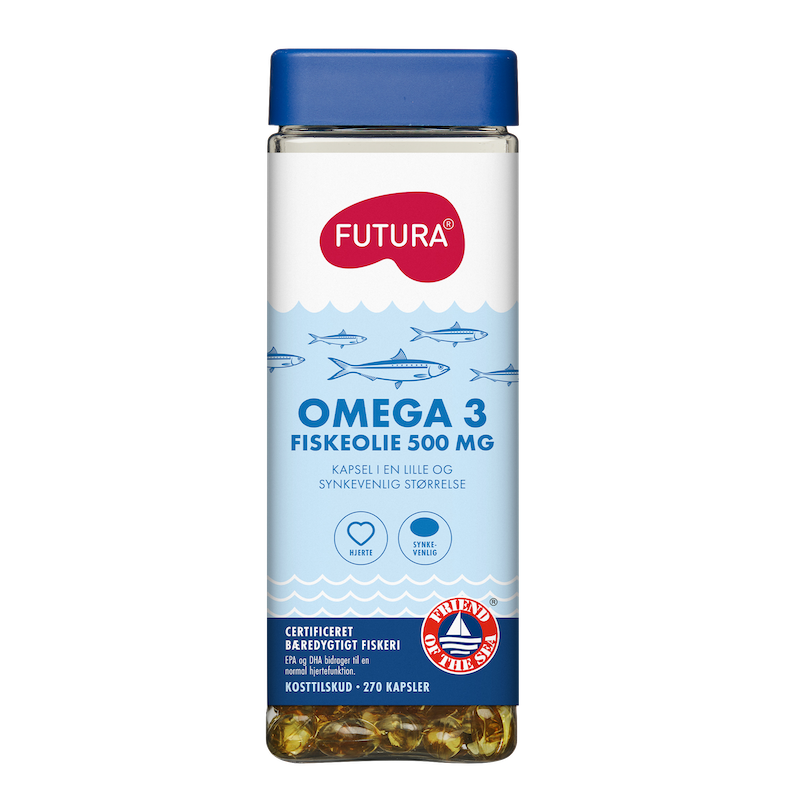 Futura Omega 3 Basic støtter hjerte, hjerne og syn med EPA, DHA og E-vitamin. Kvalitetssikret, velegnet til voksne og børn fra 11 år.