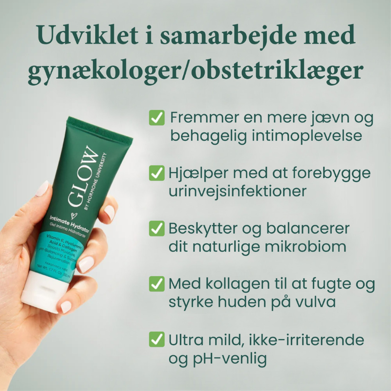 Vulva fugtighedscreme og glidemiddel med Kollagen, Vitamin E, Hyaluronsyre & Aloe. Fugter ved vaginal tørhed. Forbedrer cellernes evne til at smøre. Beroliger brændende fornemmelse og ubehag. Beskytter mod irritation. Hvis du kæmper med tørhed, irritation eller ubehag i dine intime områder, er du ikke alene. Mange kvinder står over for disse udfordringer, hvad enten det er på grund af livsstil, hormonelle svingninger, eller simpelthen som en del af deres daglige rutine. Glow's Intimate Hydrator er din go-to løsning til at lindre tørhed, irritation og ubehag i intime områder. Det virker ved at fugte dybt og genopfylde din hud med naturlige, nærende ingredienser. Uanset om du har sporadisk tørhed eller vedvarende ubehag, giver den hydrerende formel med Vitamin E, Kollagen og Hyaluronsyre en langvarig komfort.