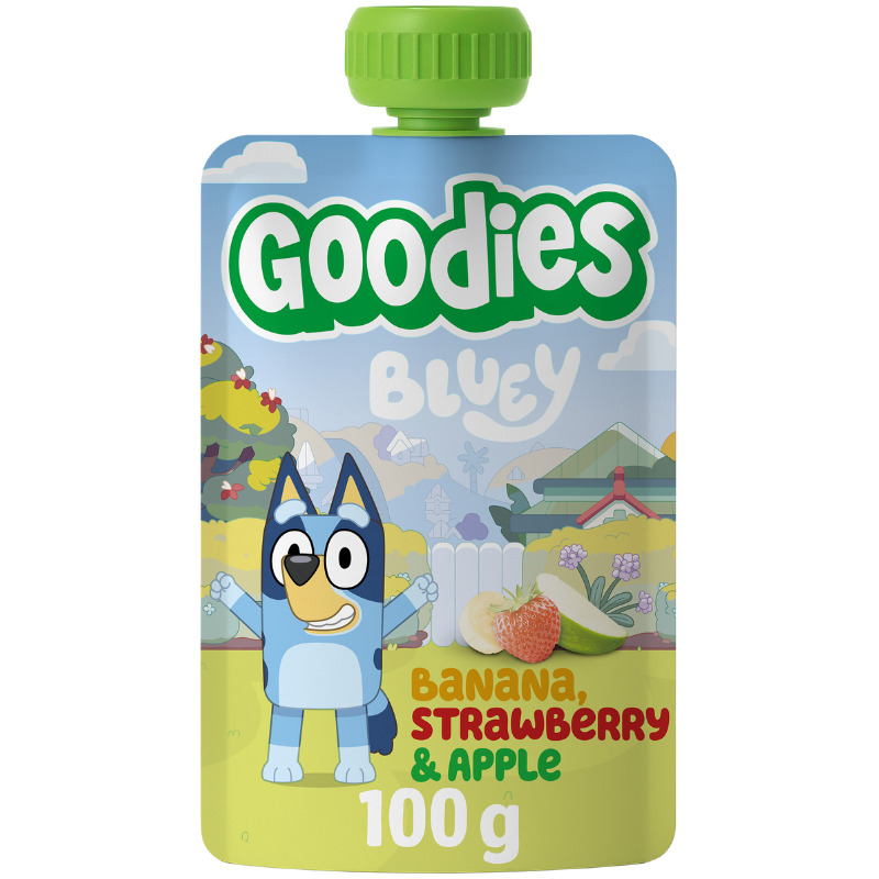 Goodies + Bluey = sandt! Prøv en lækker frugtklemmepose med Bluey, børnenes favorit. Goodies Bluey Banana, Strawberry & Apple er en lækker frugtklemmepose, perfekt til børn fra 3 år. Den har en passende størrelse, ideel til madkassen eller som et velsmagende mellemmåltid. Klemmeposen indeholder 100 % frugt – banan, jordbær og æble – og er en kilde til fiber. Ikke tilsat sukker (Med et naturligt indhold af sukker).