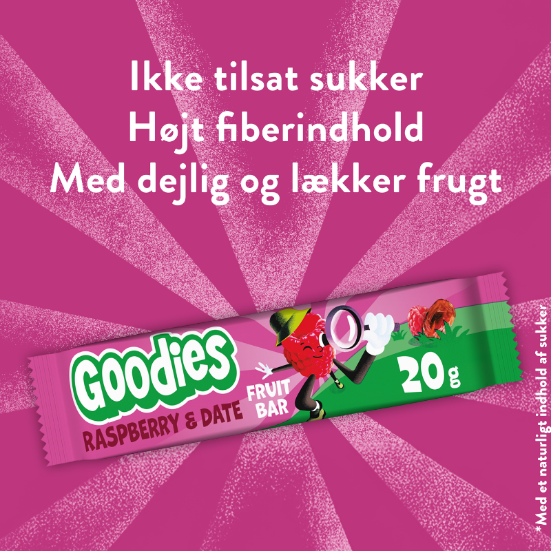 Goodies Frugtbar med hindbær og dadler er en blød og lækker bar lavet af hindbær og dadler. En velsmagende og fiberrig frugtbar, perfekt som snack til lidt større børn – fra 3 år og opefter.