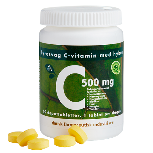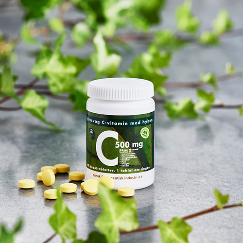 Vegetabilsk kosttilskud med vitamin C og hyben. Hver tablet indeholder 500 mg C-vitamin.