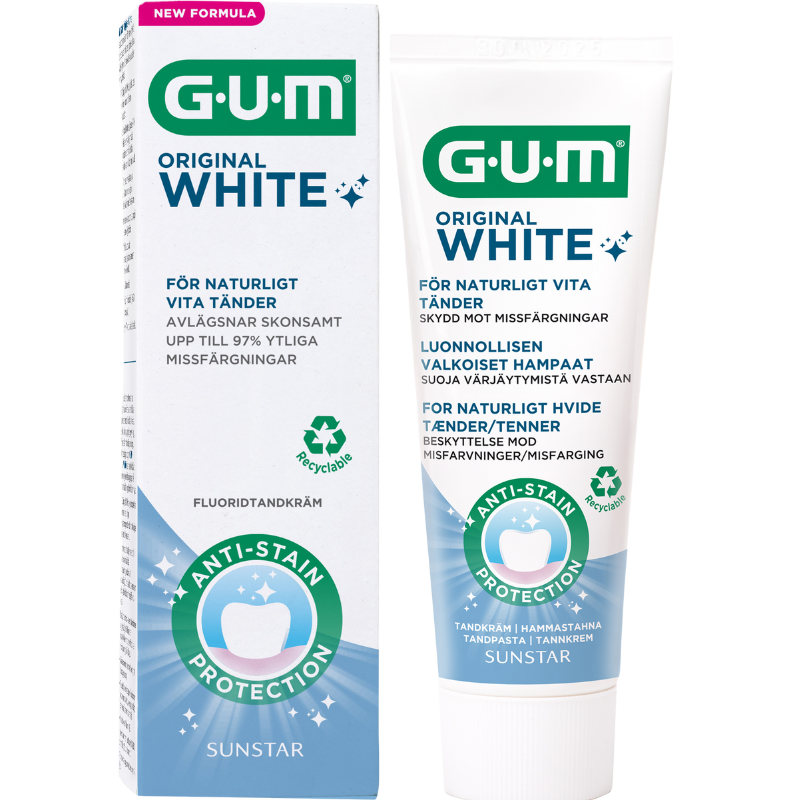 Fluorid-tandpasta 75 ml mod misfarvninger på tænderne til daglig brug. Den fjerner 97% af de ydre misfarvninger og kan holde tænderne naturligt hvide. Den nye formel er uden titaniumdioxid og er en mildere og mere effektiv formel. 24 timers beskyttelse mod misfarvninger. 100% genanvendelig pakninge og tube.