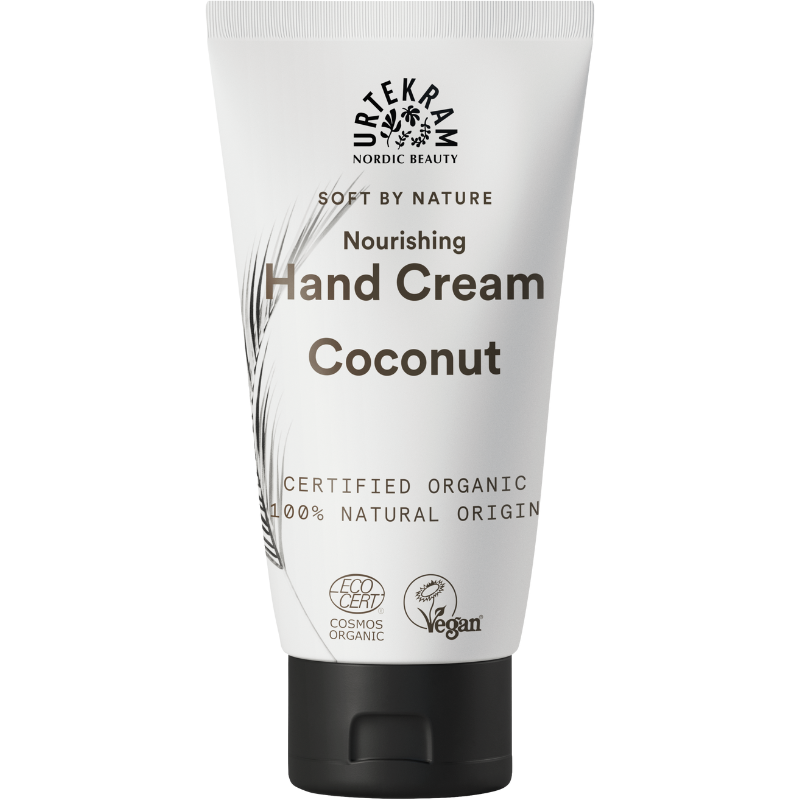 Økologisk håndcreme fra Urtekram indeholder økologisk jomfru kokosolie, hyaluronsyre samt hexapeptider der har en styrkende virkning på både negle og hud. Håndcremen har en skøn og dejlig sødmefyldt duft af kokos.