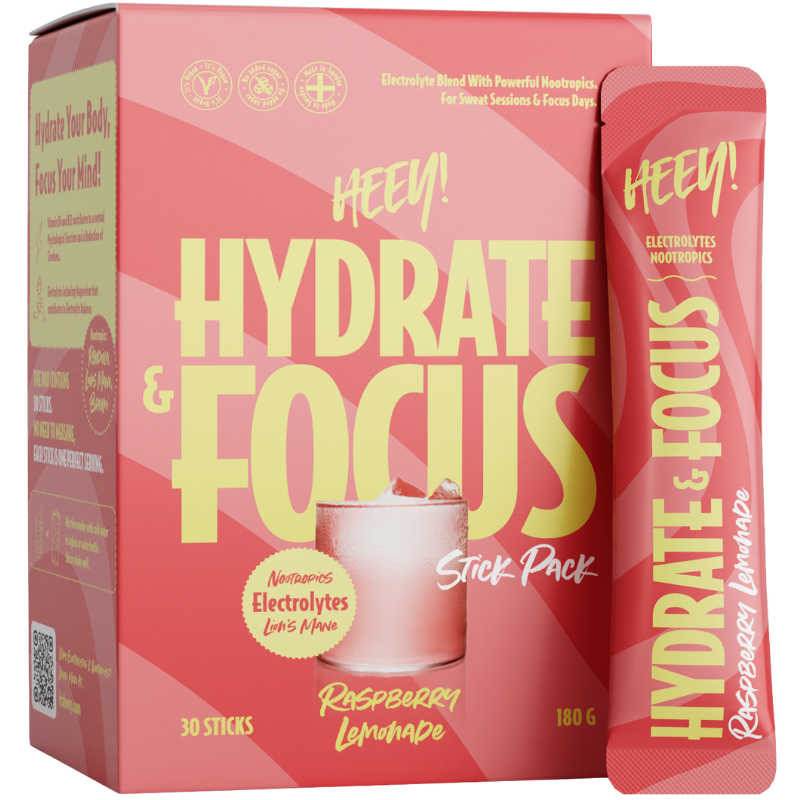 Nyd en forfriskende smag af hindbærlemonade med Heey! Hydrate & Focus. Denne veganske drik kombinerer en unik blanding af elektrolytter, Lion's Mane og vitaminer – helt uden tilsat sukker – og kan nydes som en del af en varieret og aktiv livsstil.
